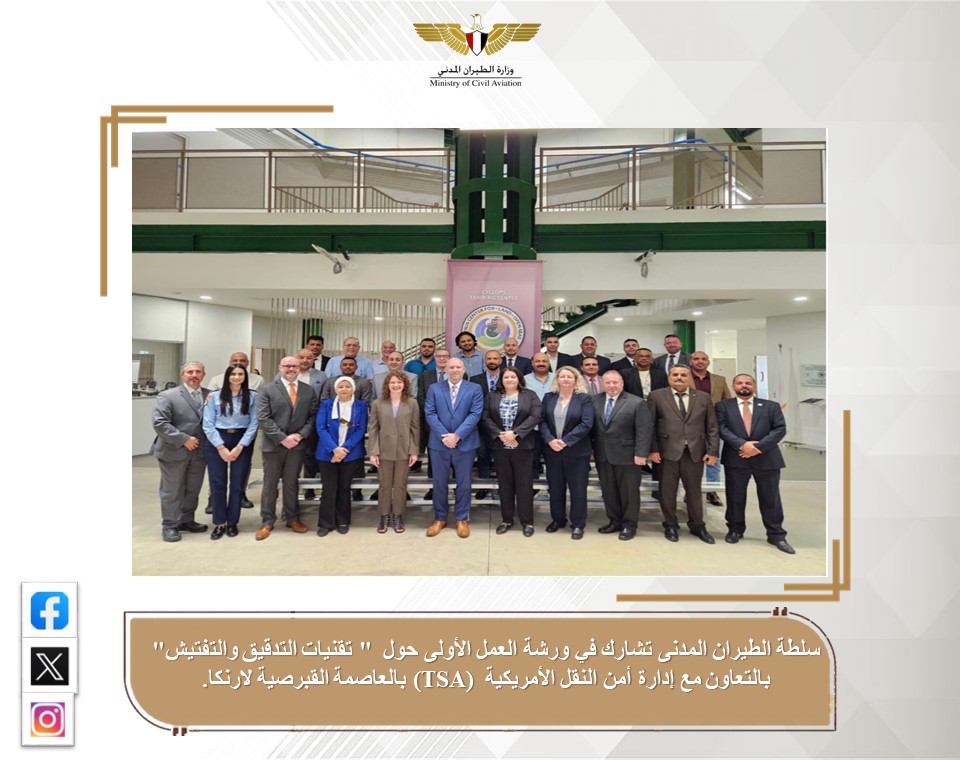 في إطار التنسيق والتعاون الدائم بين مصر وجميع دول العالم في مجال الطيران المدني،، شارك وفد من سلطة الطيران المدنى المصرى في ورشة العمل الأولى حول ” تقنيات التدقيق والتفتيش” وذلك بالتعاون مع إدارة أمن النقل الأمريكية (TSA) بالعاصمة القبرصية لارنكا؛ والتي واستمرت فعالياتها على مدار خمسة أيام خلال الفترة من ١٣ إلى ١٧ مايو الجاري، بمشاركة عدد من مسؤلي سلطات الطيران المدني بكلا من مصر وليبيا واليمن وقبرص، وهى تعد ورشة العمل الأولى من نوعها التي تجمع بين الدول الأربعة لمناقشة طرق الامتثال وأفضل الممارسات المتعلقة بمخاوف أمن الطيران لدى الدول الشريكة.