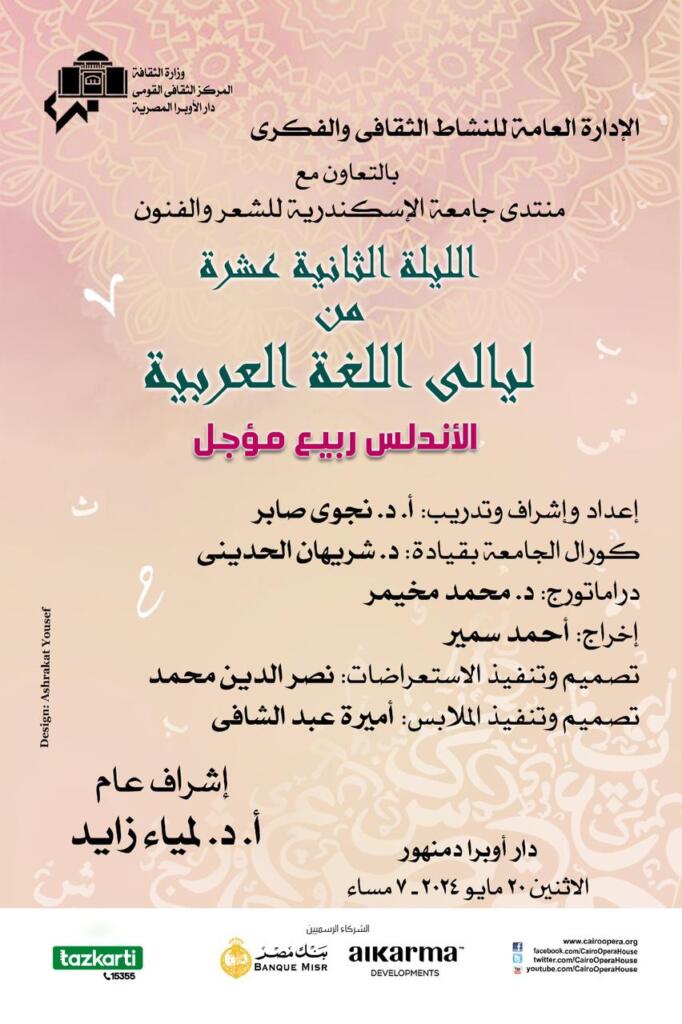 فى إطار خطط وزارة الثقافة لنشر الوعى الفكرى تواصل دار الأوبرا المصرية برئاسة الدكتورة لمياء زايد بالتعاون مع منتدى كلية الآداب للشعر والفنون بجامعة الإسكندرية تنظيم فعاليات ليالى اللغة العربية التى تأتي ضمن نشاطها الثقافى والفكرى حيث تقام الليلة الثانية عشر تحت عنوان الأندلس ربيع مؤجل ، وذلك فى السابعة مساء الإثنين 20 مايو على مسرح أوبرا دمنهور .