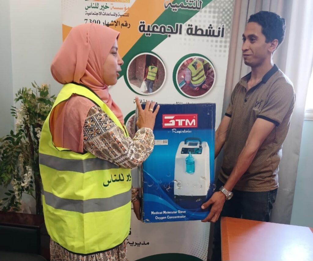 مؤسسة خير للناس للتنمية والمساعدات الإنسانية توفر جهاز مولد اكسجين بالمجان لمريضة أرملة من مستفيدي برنامج الدعم النقدي تكافل وكرامة بمحافظة أسيوط بالتعاون مع مديرية التضامن الاجتماعي بالمحافظة وتحت رعاية اللواء عصام سعد ، محافظ أسيوط.