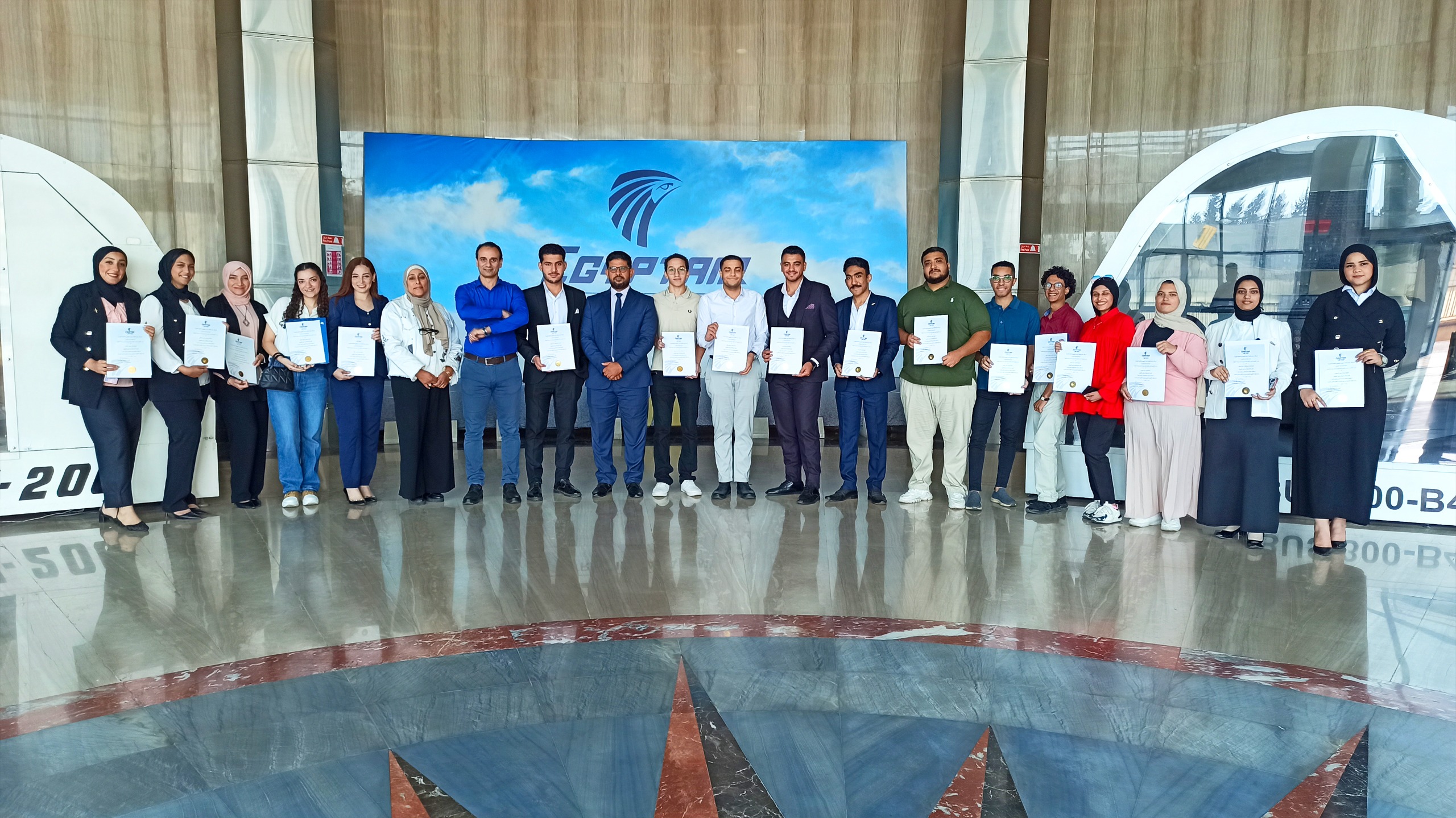 وفي نهاية الفعاليات أبدى السادة المتدربين إعجابهم بما تم تقديمه لهم من معلومات قيمة فى مجال الطيران ساهمت في تعريفهم بالمجالات التي يرغب كل منهم الالتحاق بها مما يساعد في تحديد ملامح مستقبلهم المهني، كما تم تسليم شهادات تقدير لهم في ضوء مشاركتهم الفعالة والتي وجدت تفاعلا كبيرًا من جانب الكثير من الشباب المهتمين بمجال صناعة النقل الجوي.