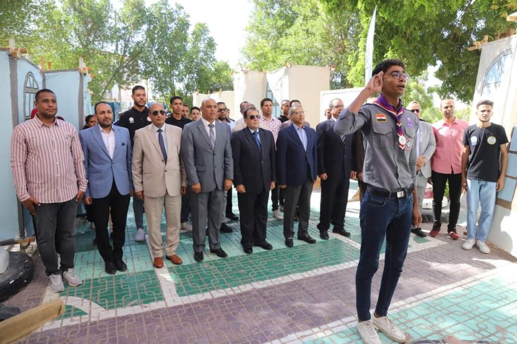 في بداية الاحتفال قام رئيس الجامعة ونواب رئيس الجامعة بتحية العلم وتفقد المعرض الفني والذي يضم العديد من اللوحات الفنية المتنوعة من اعداد طلاب كليه التربية الرياضية