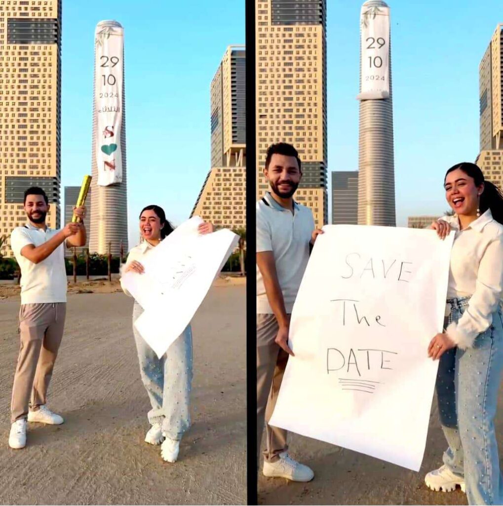 وتضمن الفيديو الذي صوره الثنائي الإعلان عن موعد زفافهما المقرر في 29 أكتوبر، ورفع لافتة تحمل الأحرف الأولى من أسمائهما، كرسالة منهما للاحتفال بزواجهما وأيضا للترويج لمعالم العاصمة الإدارية الجديدة.
