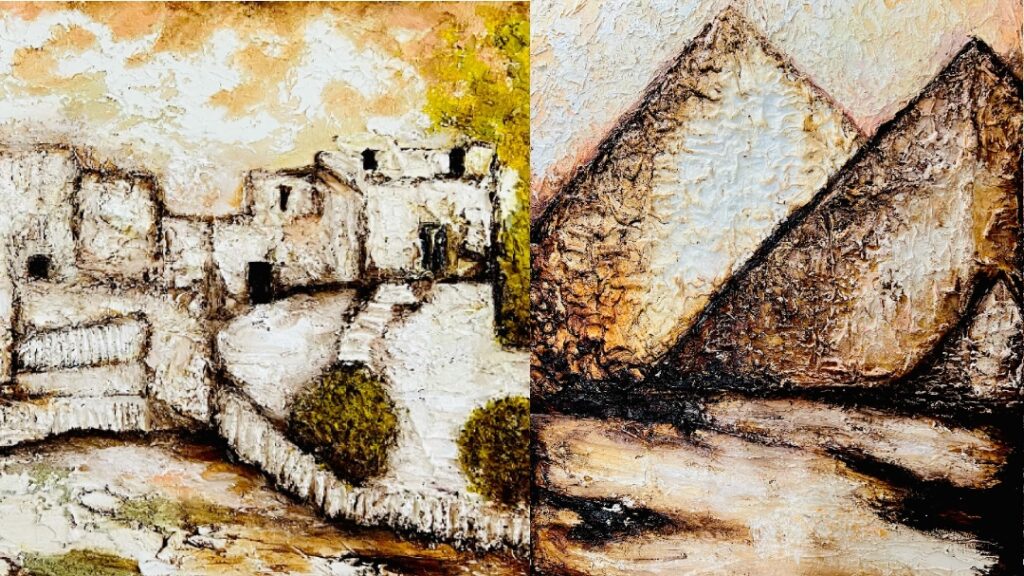 فالأهرامات فيها الكثير من الغرائب التي حيرت العلماء فوقفوا عاجزين أمام كشف أسرار بنائها، وظلت اللغز المحير الذي نسج حوله الناس أساطير مختلفة و حيّرت الفنانة فاطمة و جعلتها تبحث و ترسم ذالك السرّ المخفي في مصر ام الدنيا